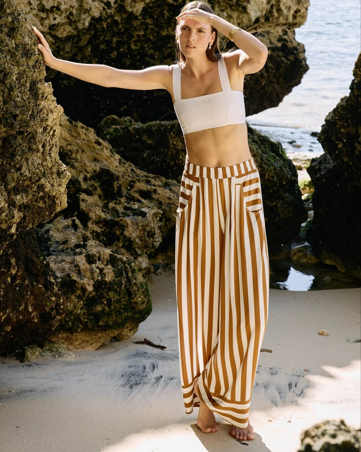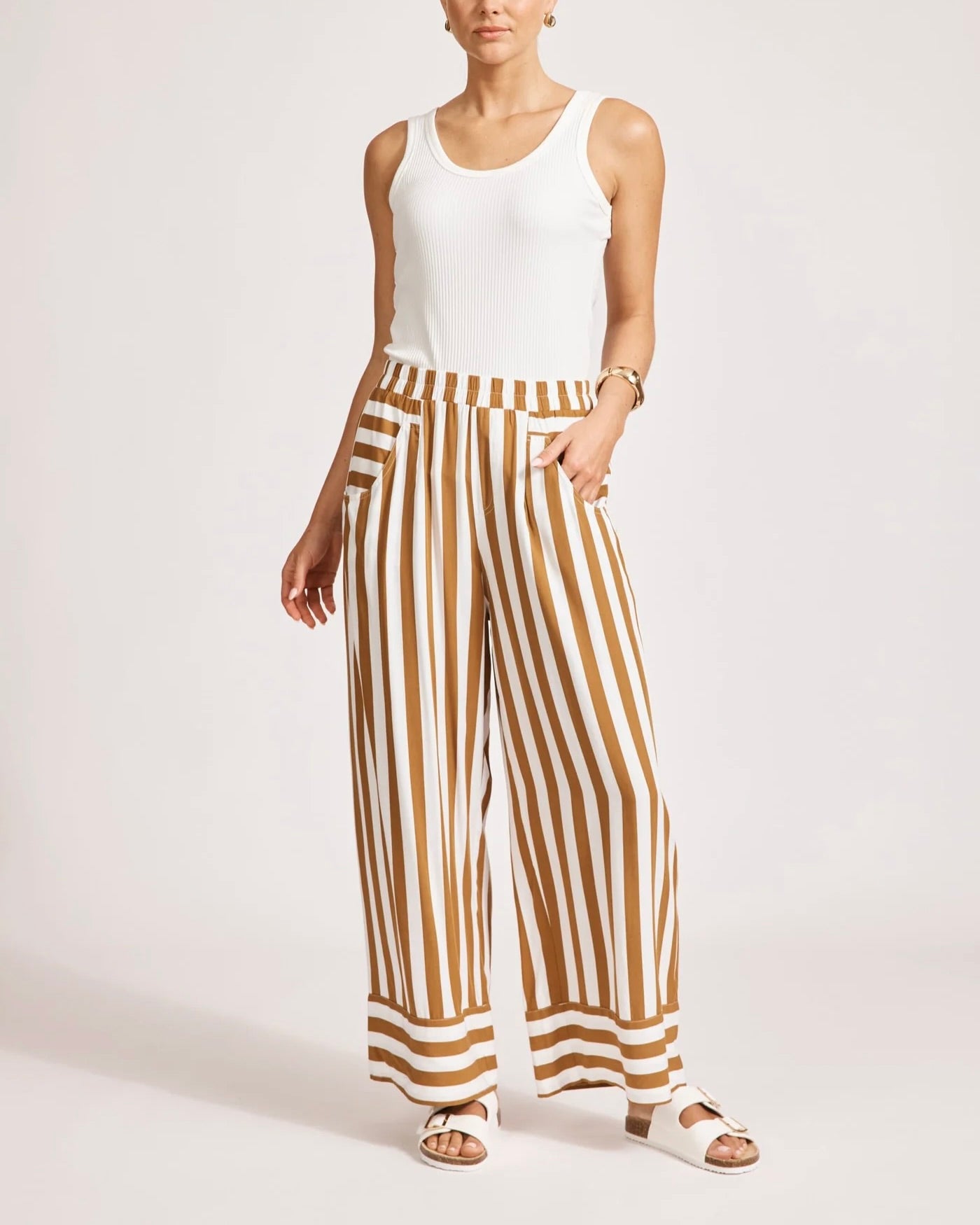 Made from washed rayon for a lightweight, draped feel these wide leg trousers feature an elastic waist, side and back pockets, and contrast stripe detail at the hem and pocket edges.Style with the Treville Stripe Shirt for a bold coordinated look, or pair with a white tank for your new weekend go to.