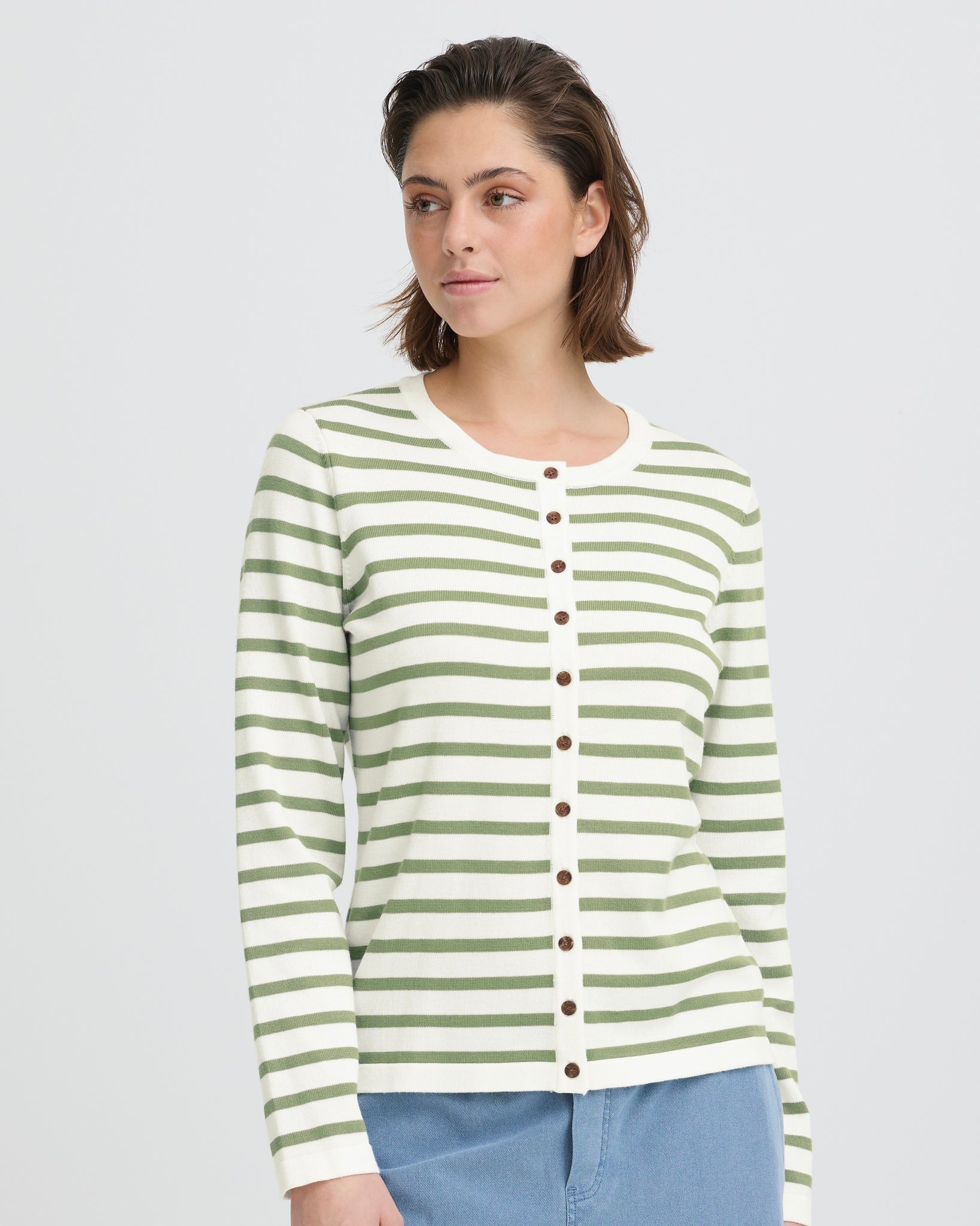 Button cardigan with a streamlined fit, crew neckline, and long sleeves. Smooth texture and clean lines deliver a minimalist look. Full-length button placket adds subtle structure to this versatile layering piece.