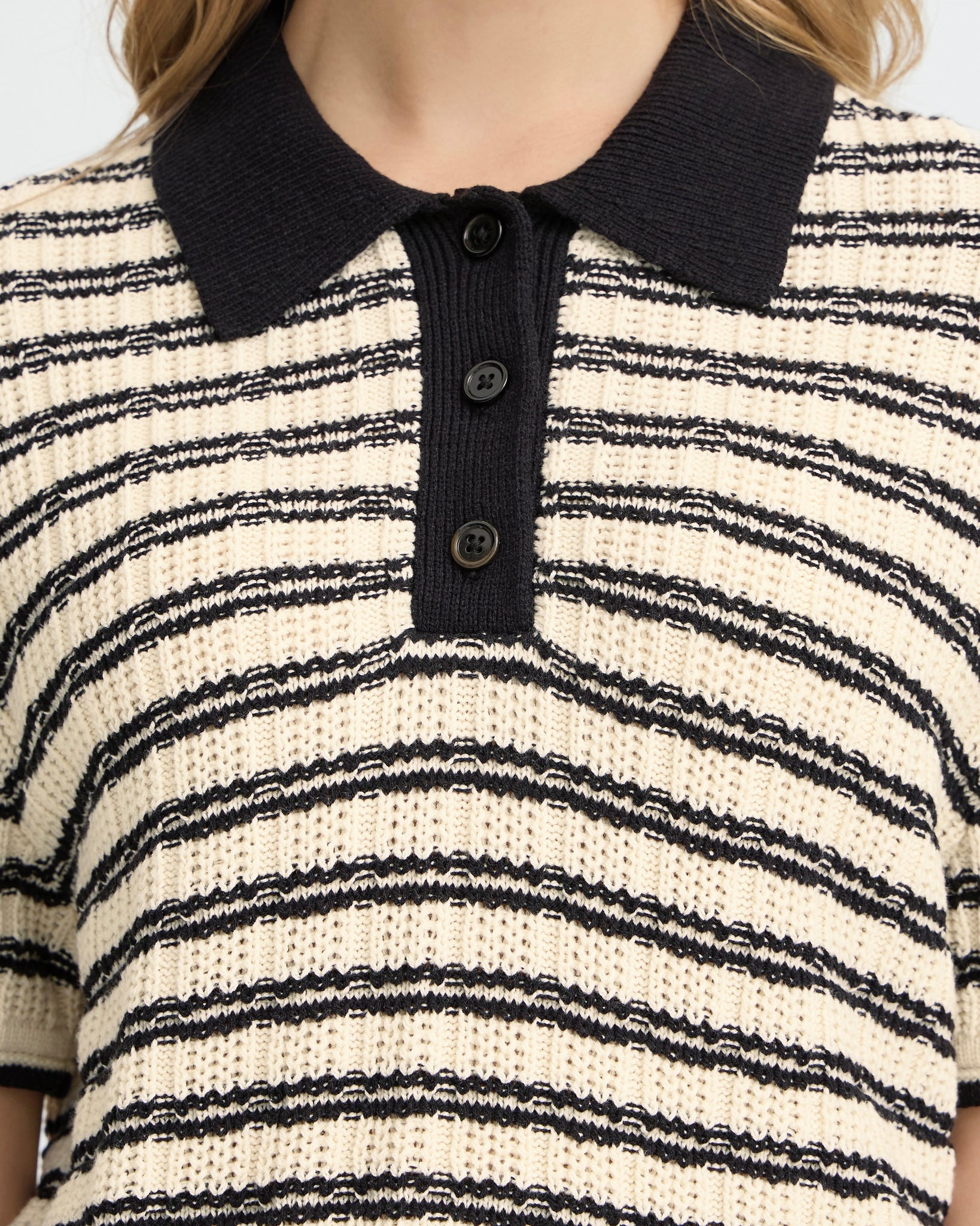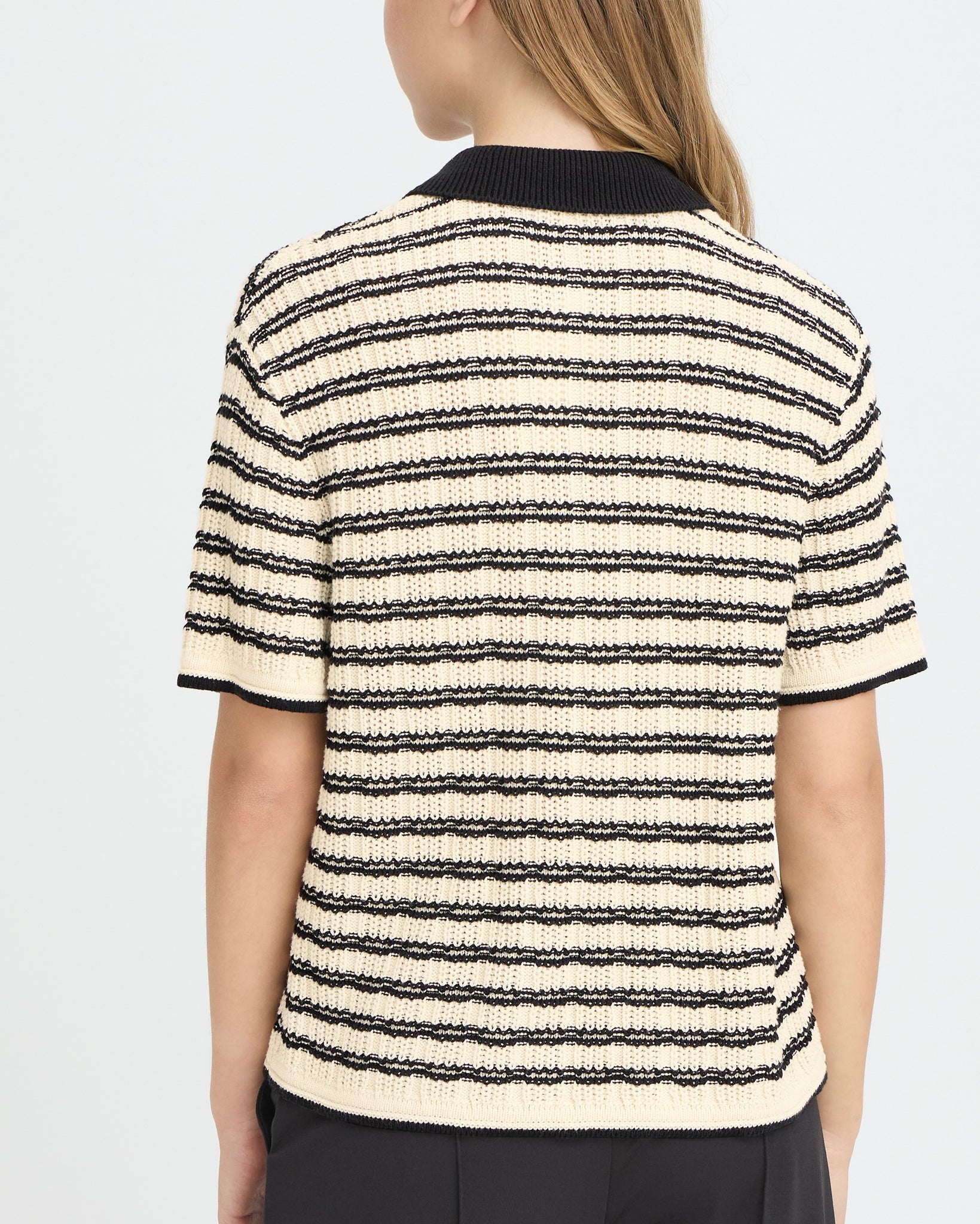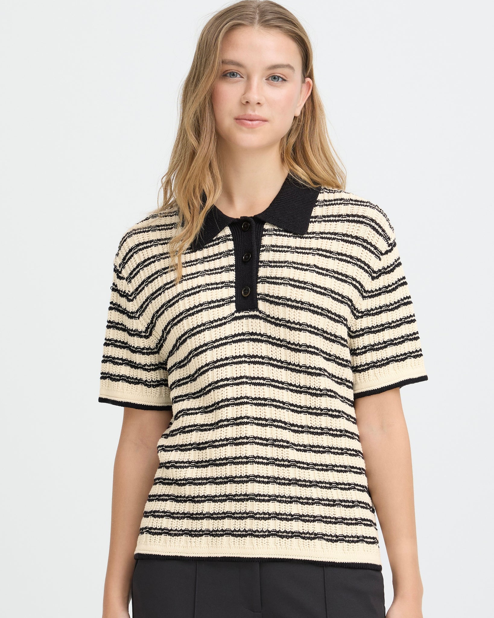 A textured knit polo-style top in birch with contrasting black stripe detailing and collar. The structured knit fabric offers subtle texture and visual interest, while the classic polo silhouette provides versatile styling options for casual and smart-casual occasions.