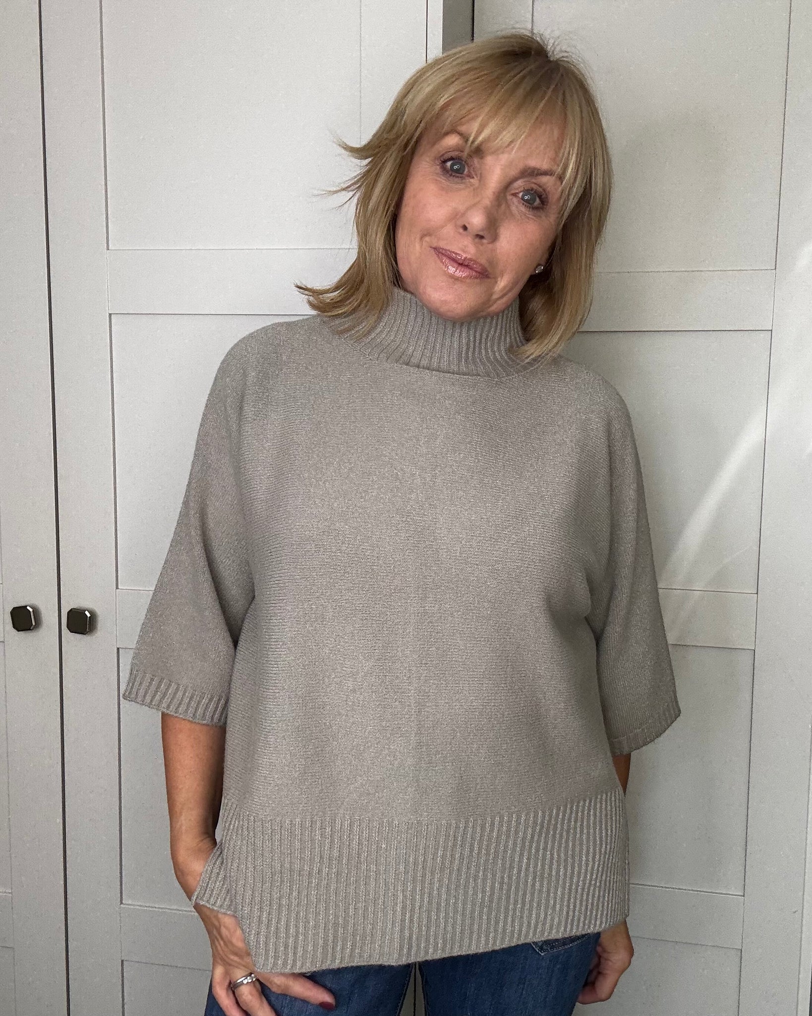 The Supersoft Belle Jumper in brown features a relaxed fit with a loose, boxy silhouette for comfort and style. It has half-length sleeves finished with deep ribbed cuffs, split sides for ease of movement, and a ribbed hem that drops slightly lower at the back. Pair with our supersoft Jessie or Eva knitted pants for the complete co-ord