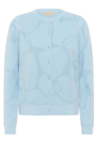 The Culture Hearty Cardigan in pale blue features subtle shimmering heart detailing, a classic crew neck, delicate buttons and an easy, relaxed fit.