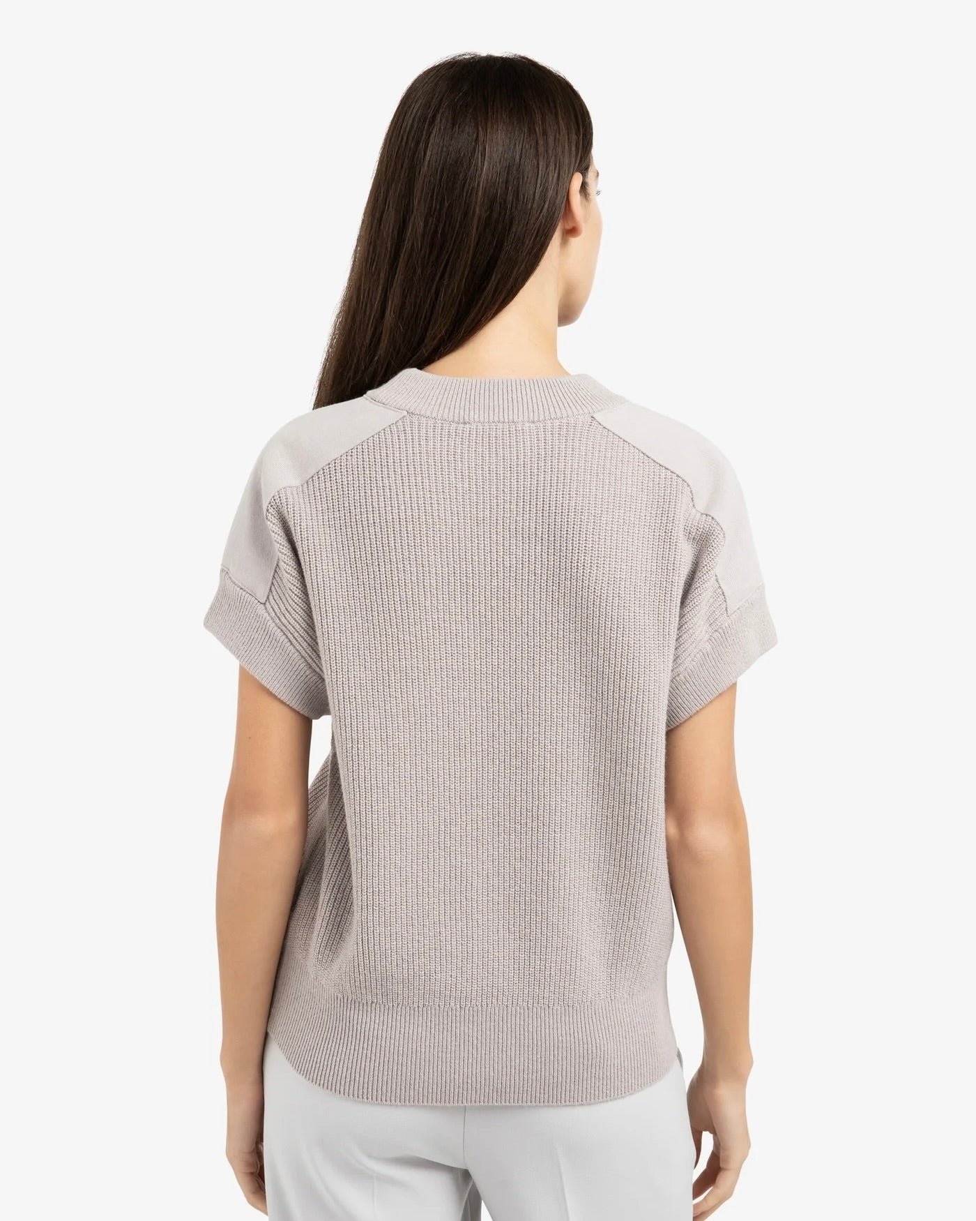 This knitted top is designed with short sleeves, a round neckline, and a regular fit. The woven inserts on the shoulders create a subtle contrast in texture and add a modern twist to the design. Made from a soft cotton blend, its perfect for layered looks or to wear on its own.