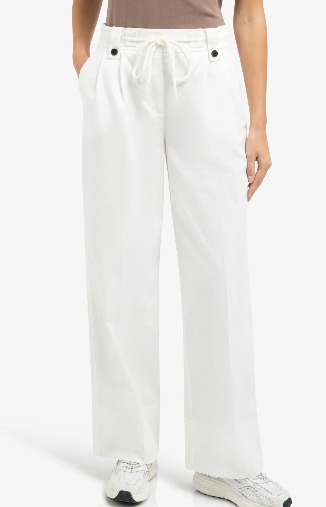 These comfortable woven trousers feature a high waist with elastic waistband and a drawstring with metal ends. Designed with pleats at the front and wide legs for a relaxed, feminine look. Finished with side pockets and welt pockets at the back. Perfect for casual yet polished styling.