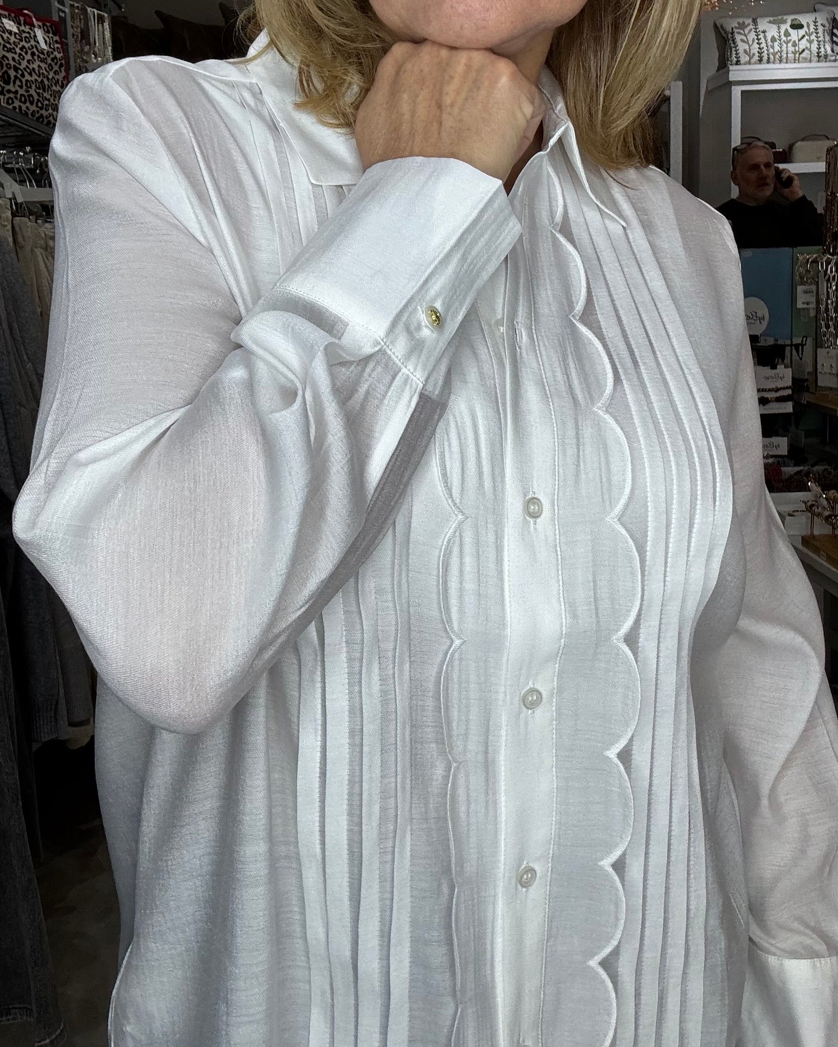 The Yest Deborah Blouse in soft white is a delicate, feminine top featuring a pin tuck front detail. It has a button placket edged with a scallop design and pretty button accents on the cuffs and collar.