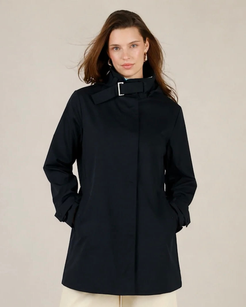 The Yest Xandra Jacket combines practical style with everyday functionality. This navy funnel neck mac-style coat features a relaxed fit that skims the thigh, making it ideal for layering through transitional seasons. Water-repellant fabric keeps you protected from light rain, while the buckle neck fastening and concealed button closure offer secure, adjustable wear. A versatile piece that works equally well over casual or smart outfits.