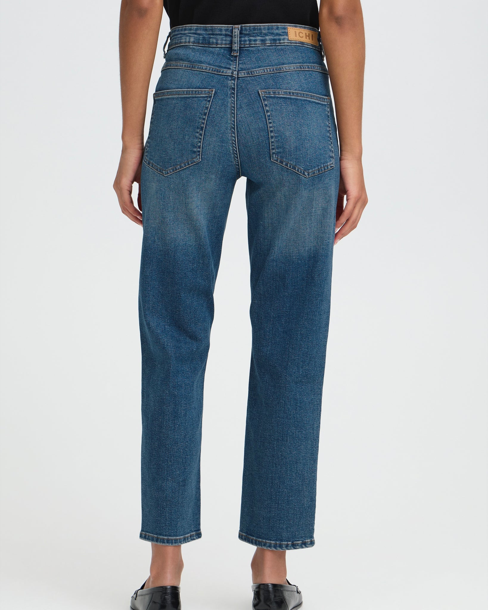 ICHI Twiggy Raven Jean in dark blue features an ankle length straight-leg silhouette with classic five-pocket styling, zip fly, and button closure. The loose fit and comfort waist provide all-day wearability, while subtle fading adds character.
