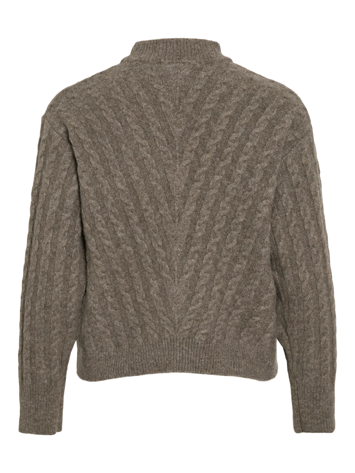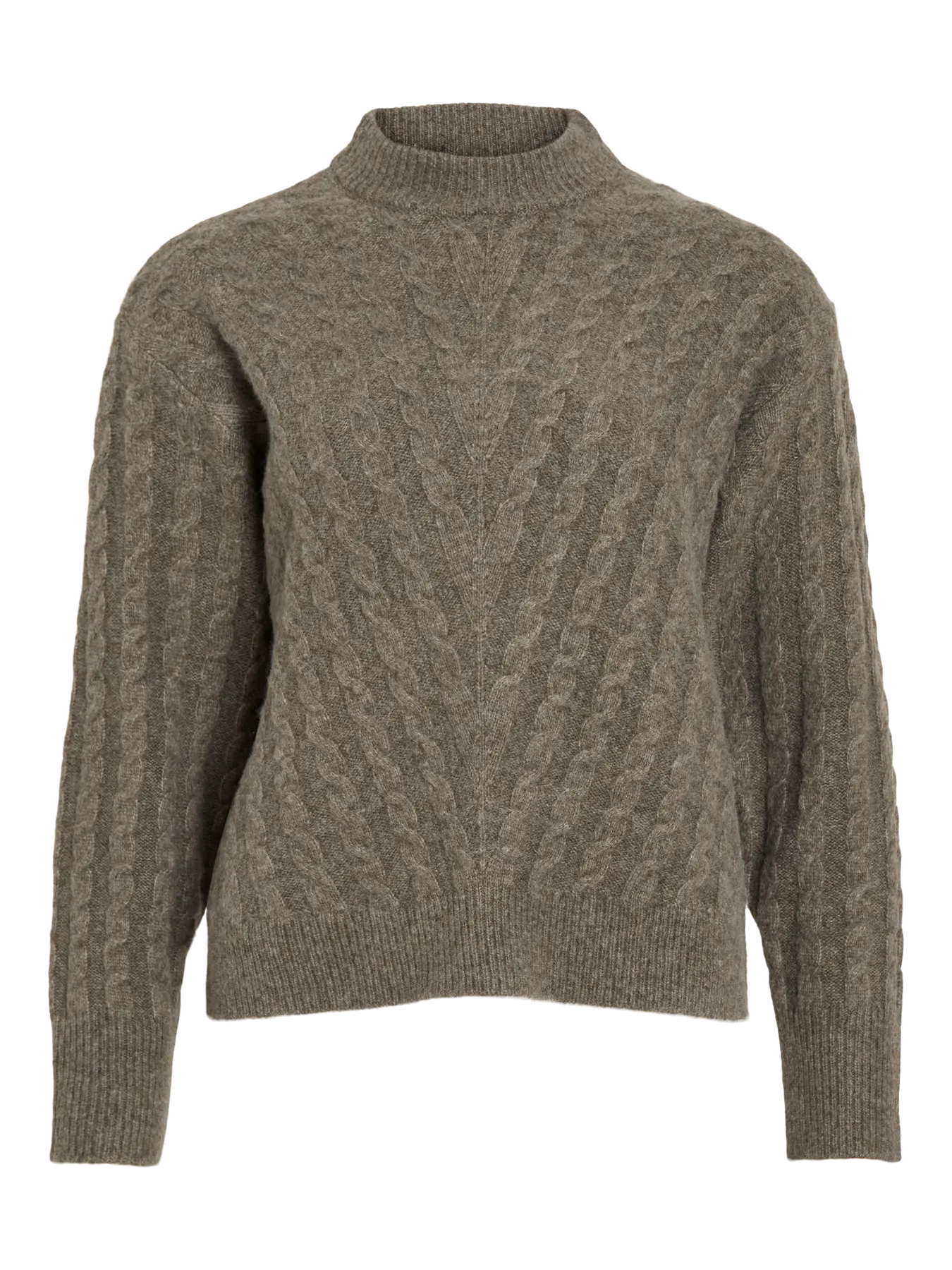 High neck sweater featuring V pattern cable design that adds texture and visual interest.