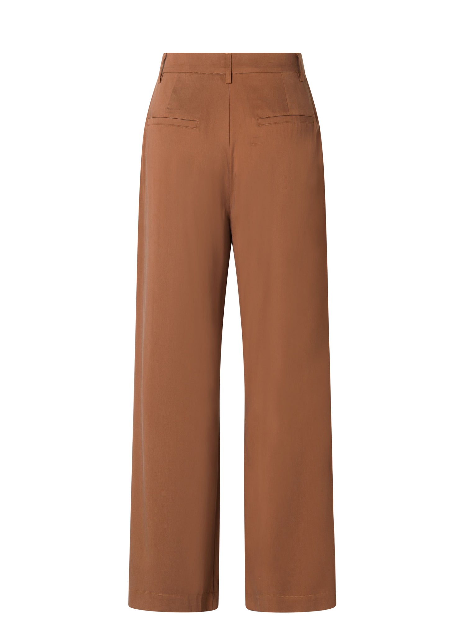 These classic pleat front trousers in copper brown feature a silky fabric that offers a smooth, comfortable fit. Designed with practical side pockets and stylish faux slit back pockets, they combine functionality with timeless style suitable for both casual and formal occasions.