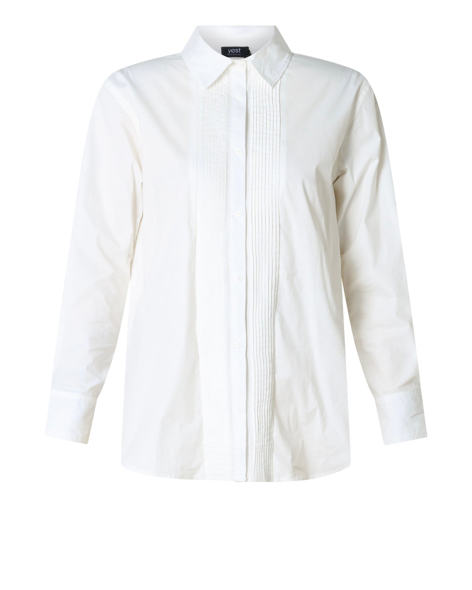 The Yest Darina Blouse in off white offers a classic, crisp look with soft front pleats that add subtle texture. Its embroidered cuffs are detailed with crystal Bumble Bee buttons for a refined touch.